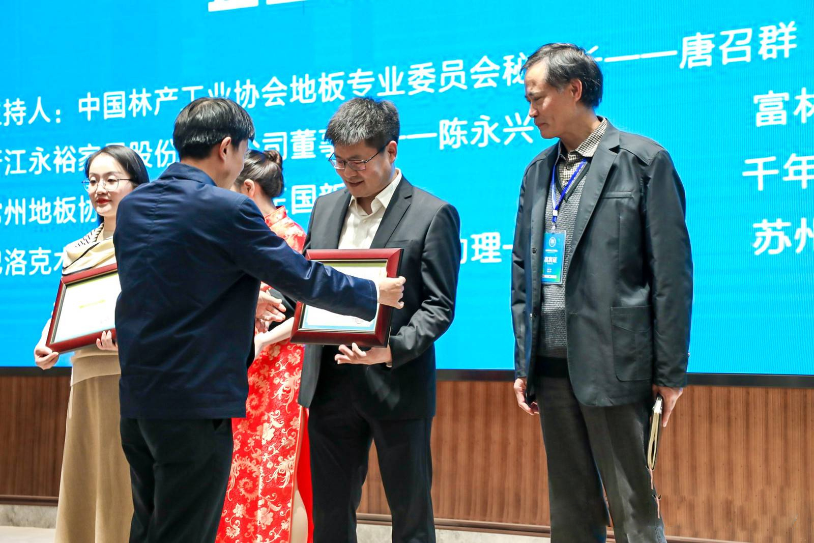 会上开展了主题为“有效益的绿色发展”的企业家论坛。中国林产工业协会地板专业委员会秘书长唐召群先生主持,D体育(中国)董事长蒋卫参与论坛并发言:“做D体育网22年,在原材料采购环节,D体育(中国)为自身企业建立了绿色供应链系统,对原材料质量严格把控,引入产品来源追踪和透明机制,实施可持续的商业发展战略;在生产过程中,使用绿色能源,包括电叉车的更新使用、引进自储能电锅炉(中科院项目研发)等,现在的投资是为了将来的可持续发展;质量也是绿色发展不变的主题,D体育(中国)在2012年就通过CNAS实验室认证,我们的每一片地板都是经过严格检测的;最后呼吁我们行业一起把D体育网真正做起来,满足消费者绿色需求!”中国林产工业协会地板专业委员会理事会吕斌先生为D体育(中国)董事长蒋卫颁发“绿色领袖企业家”荣誉奖。