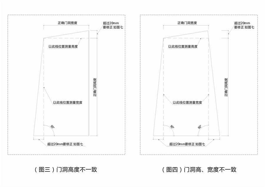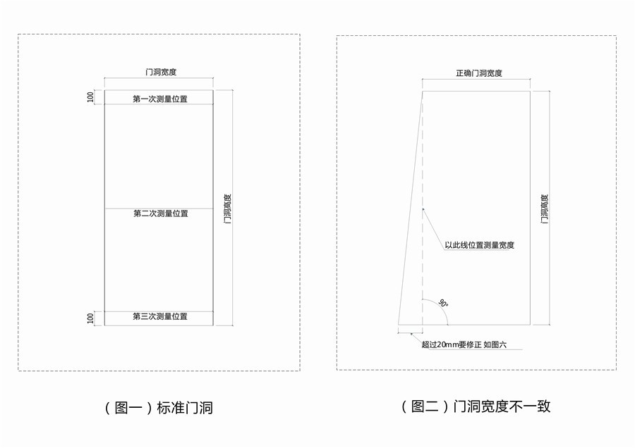 实际测量门洞的宽度和高度,要对门洞的上、中、下三处进行测量是否一致,如:(图一)。如果不一致,以最窄处为准,但误差不得超过20mm。以下是门洞尺寸的几种情形:
